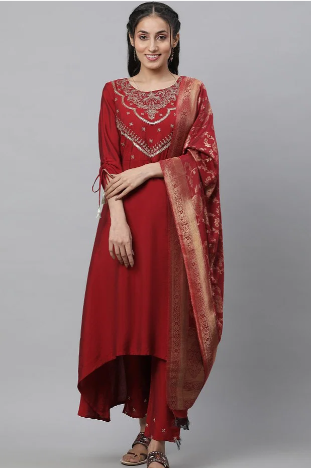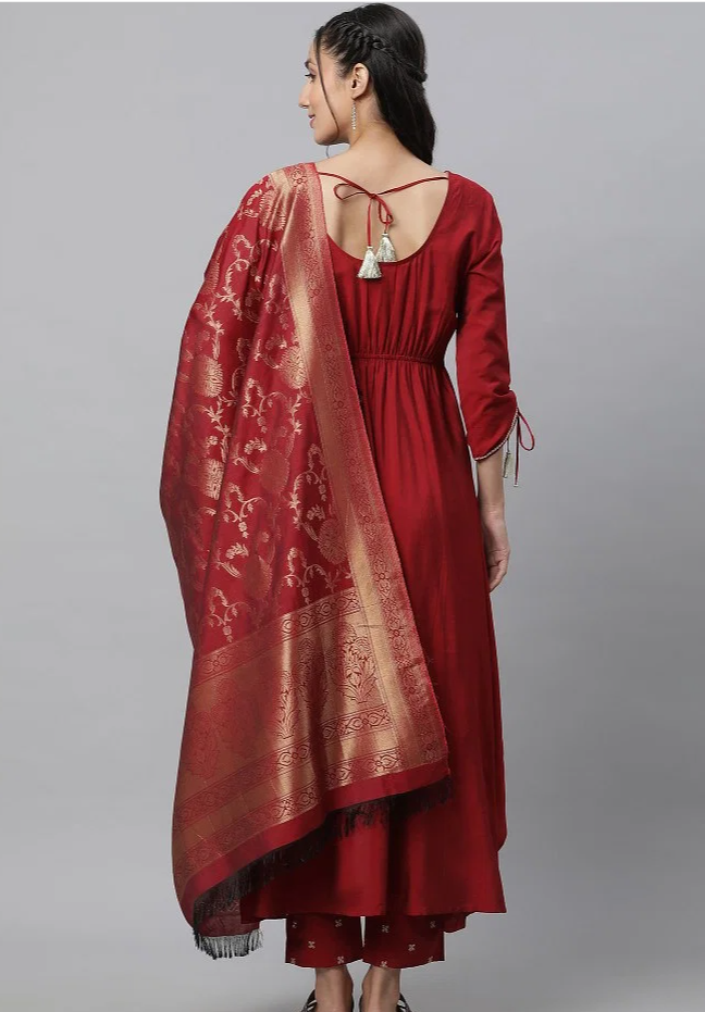 Red Zari Embroidered Kurta, Pants and Jacquard Dupatta